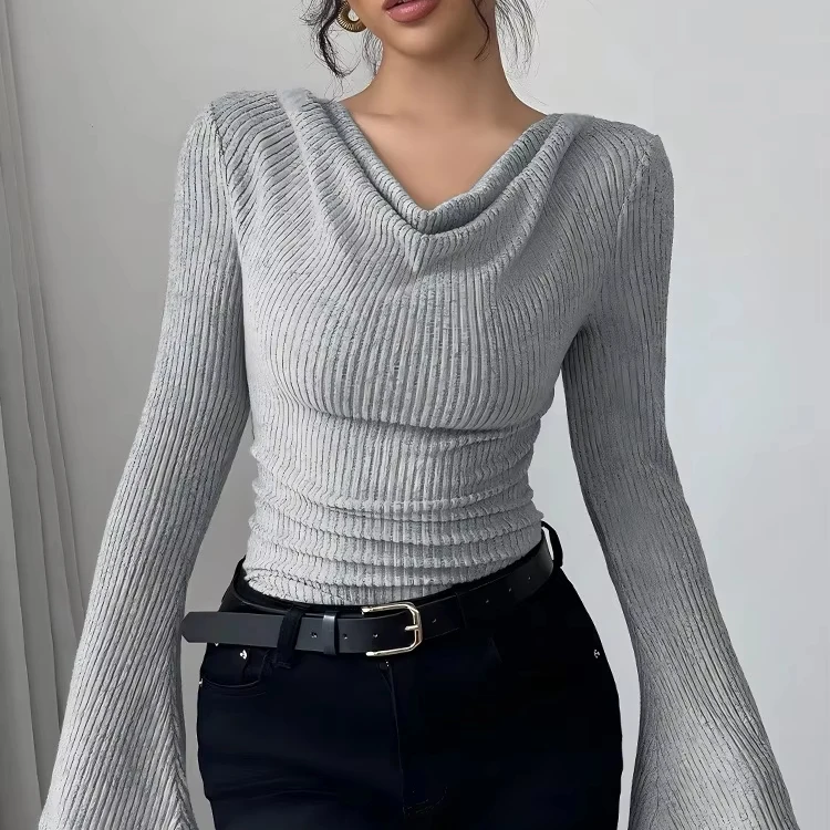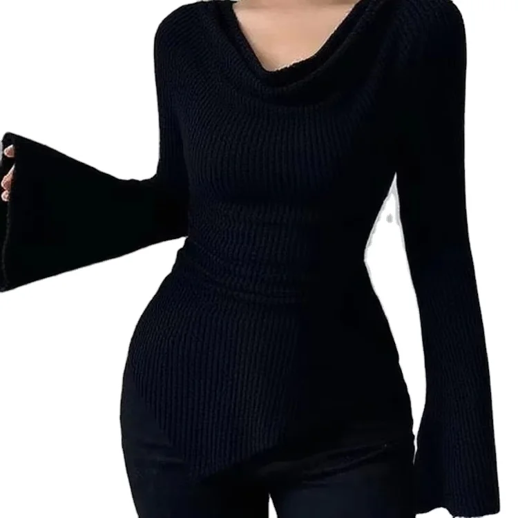 Womens Autumn Winter Slim Long Sleeve Base Layer Top Ribbed Knit Flowing Collar Woven ELEGANT Polyester Fiber Sweater
